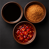 Acompañamientos clásicos, verduras y salsas al estilo coreano.